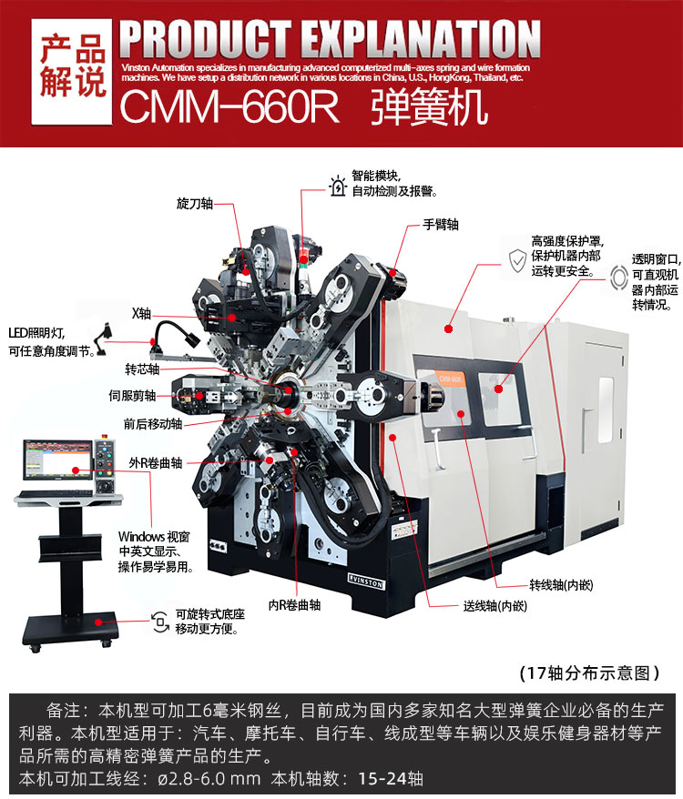 • 產(chǎn)品概述: CMM-660R 電腦彈簧機(jī) 可生產(chǎn)?2.8-6.0 mm線徑彈簧及線成形等)本機(jī)采用獨(dú)特的無凸輪和無搖臂設(shè)計,由多組伺服馬達(dá)獨(dú)立控制,可以生產(chǎn)各種各樣異型彈簧、壓簧、拉簧、雙扭簧、渦卷簧、扁簧(發(fā)條簧)汽車配件,汽車彈簧,家具五金,衛(wèi)浴線材成型及復(fù)雜線材成型等。精密準(zhǔn)確、調(diào)機(jī)快速、穩(wěn)定可靠。