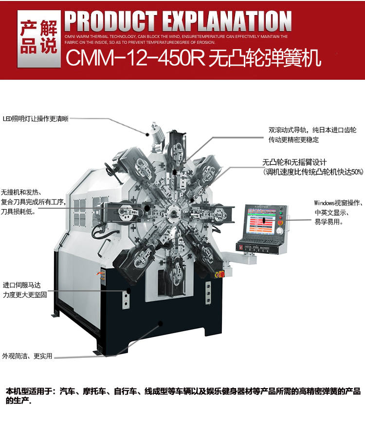 其次,永騰無凸輪彈簧機上無滾動式導(dǎo)軌,可長久保持精度。無撞機和發(fā)熱,復(fù)合刀具完成所有工序,工具損耗低。適用于汽車、摩托車、自行車、線成型等車輛以及娛樂健身器材等產(chǎn)品所需的高精密彈簧的產(chǎn)品的生產(chǎn).