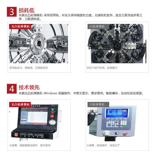 在近幾年無凸輪彈簧機(jī)逐漸得到彈簧生產(chǎn)廠家的認(rèn)可。與傳統(tǒng)帶凸輪彈簧機(jī)相比,永騰無凸輪彈簧機(jī)在設(shè)計(jì)上采用獨(dú)特