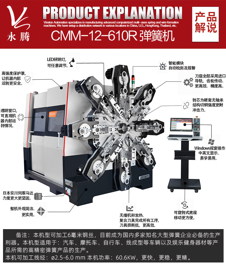 本機型適用于汽車、摩托車、自行車、線成型等車輛以及娛樂健身器材等產(chǎn)品所需的高精密彈簧產(chǎn)品的生產(chǎn)。